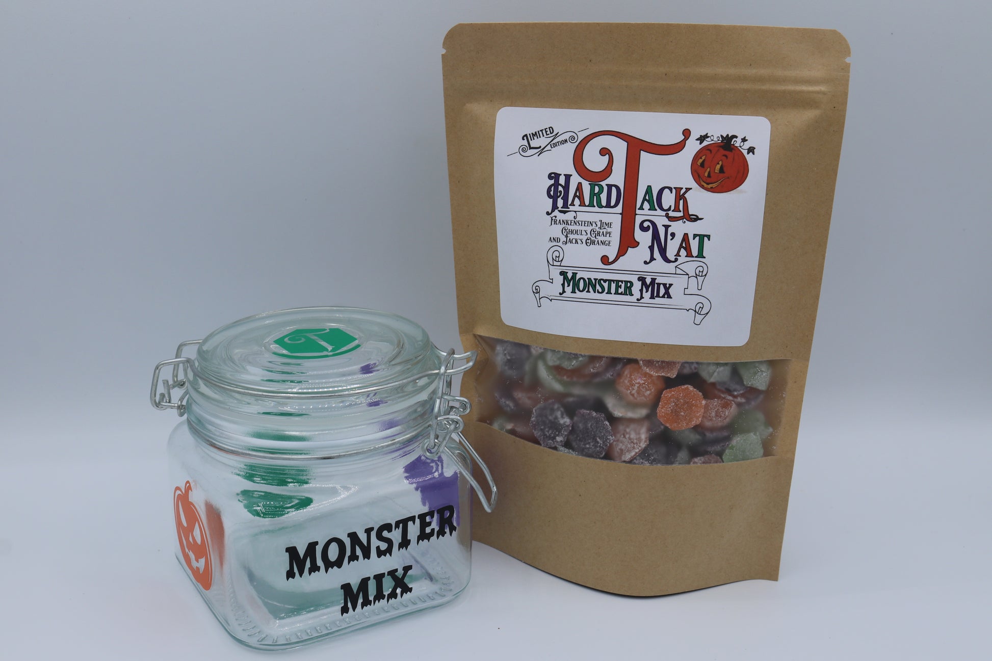 Enjoy your favorite holiday candy mix in a handcrafted airtight jar. You get one pound of your choice of Monster Mix or Harvest Medley. Plus a matching jar that will really show off your candy. Make your holiday display extra festive with these stylish jars! An impressive presentation that's sure to impress your guests - and make every snack session even sweeter!