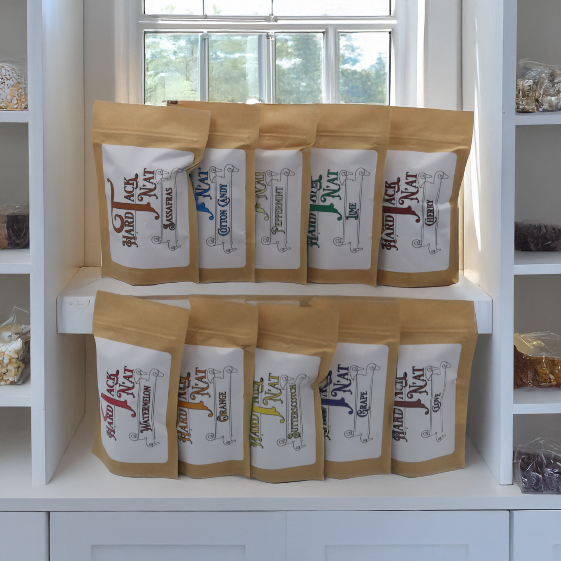 Double the fun with the Pick 10 N'at Pack! Choose any ten quarter-pound bags of candy to craft your ultimate collection of delicious hard tack flavors. From classic favorites to adventurous picks, this bundle is great for parties, events, or treating yourself to a sweet stash. Need a smaller option? Try our Pick 5 N'at Pack, or go all out with the Pick 15 N'at Pack for the biggest variety!